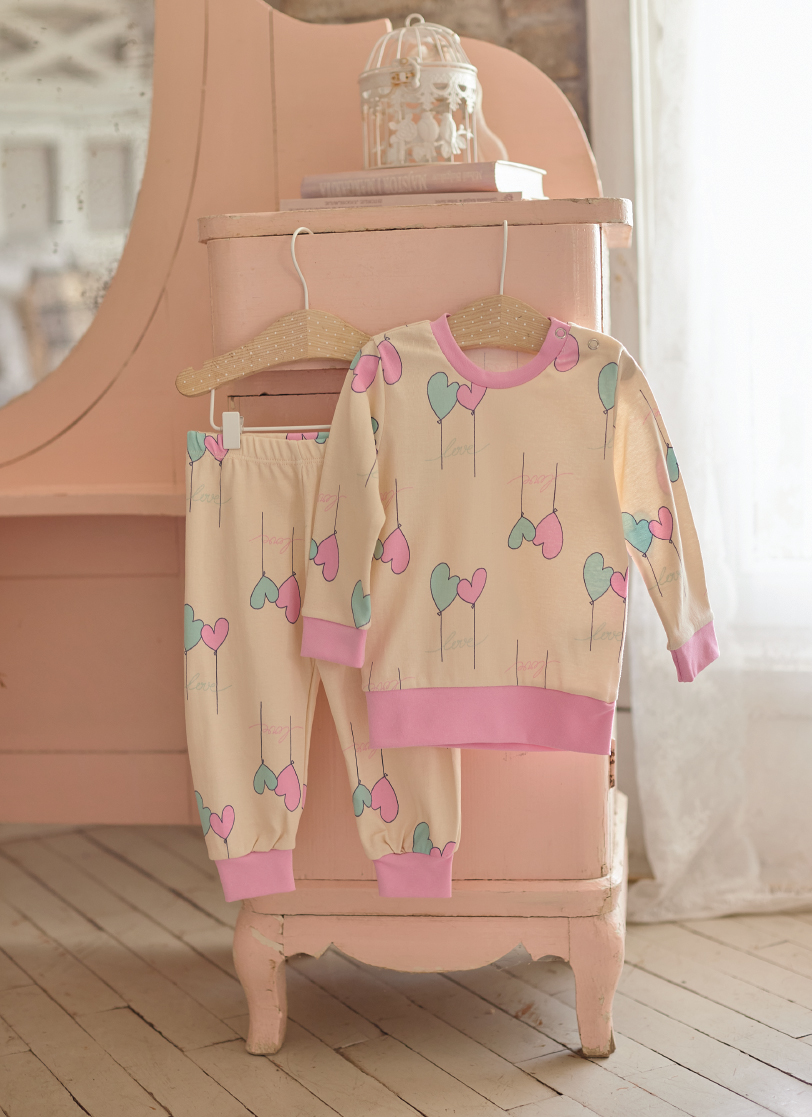 Pidžama dugih rukava u bež boji za bebe devojčice sa dezenom sa srcem deo je Sweet heart kolekcije. Kreirana je u potpunosti od pamuka što je čini udobnom za nošenje i veoma prijatnom prema dečijoj koži. Zbog svog zanimljivog dizajna i prirodnog materijala idealan je poklon za vaše najmlađe.